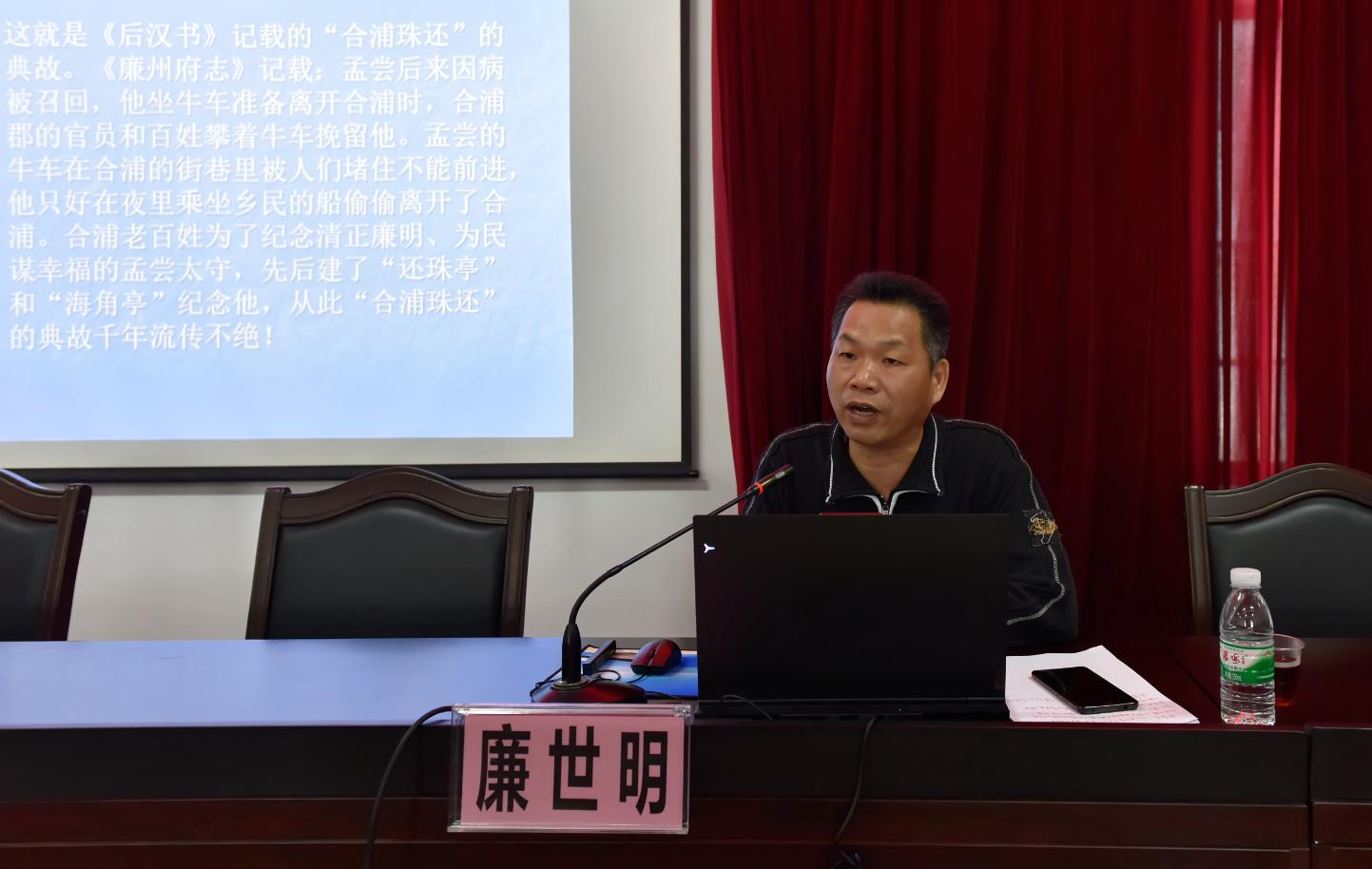 10月22日,合浦县第八场“廉州之廉”巡回大讲堂活动在县农业农村局举行。县博物馆馆长廉世明应邀授课,县农业农村局党组成员、副局长陈宗琼主持活动。