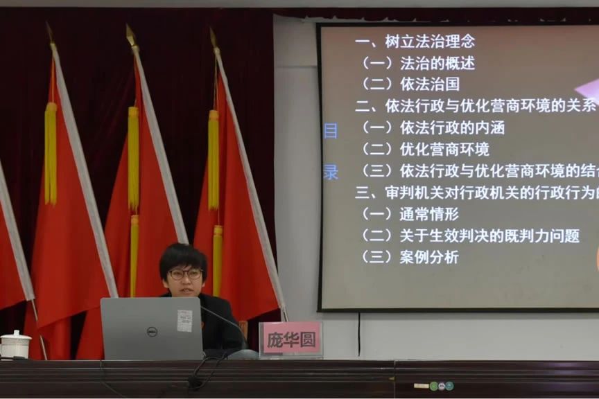 摄) “当前我国政府职能转变的一个重要内容就是从管制行政走向服务行政,依法行政是建设社会主义法治国家的关键和难点所在……”大讲堂活动上,庞华圆以“优化营商环境法治教育”为题,从法治的起源讲起,通过举例子、列数据、作比较等方式,详细讲述了依法行政与优化营商环境的关系、审判机关对行政机关行政行为的法律审查等内容,并结合讲述自身查办案件经历,加深现场党员干部对行政法律法规的了解和掌握,进一步提高法治意识、履职意识和廉洁意识。 “庞法官从法治的高度全面详细讲解了依法行政的重要意识,对我们依纪依法依规履职起到了促进作用,今后我们一定要进一步加强党纪法规的学习,不断提高履职能力,为全县优化营商环境奉献力量。”县自然资源局一名干部表示。 庞华圆授课(马昆