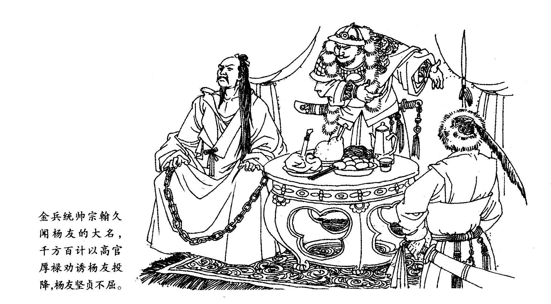 北宋宣和七年(1125年),金朝以宋朝招纳了金朝的叛将为借口,举兵入侵中原,迅速侵占了燕京等地。然后分兵两路,一路攻打太原方向,另一路从燕京南下,直扑汴京。靖康元年(1126年)闰十一月二十五日,金兵攻克了汴京(今河南开封),太上皇宋徽宗赵佶和当朝天子赵桓被俘,成了金人的阶下囚。朝廷紧急征召杨友以宋宫保侍卫的身份,陪同潘良贵、郭孝友等北宋大臣出使金国,与金国谈判。金兵统帅宗翰久闻武状元杨友的大名,千方百计以高官厚禄劝诱杨友投降。杨友坚贞不屈,破口大骂金兵,受到了金人毒打,但他依然一身正气,毫不屈服。